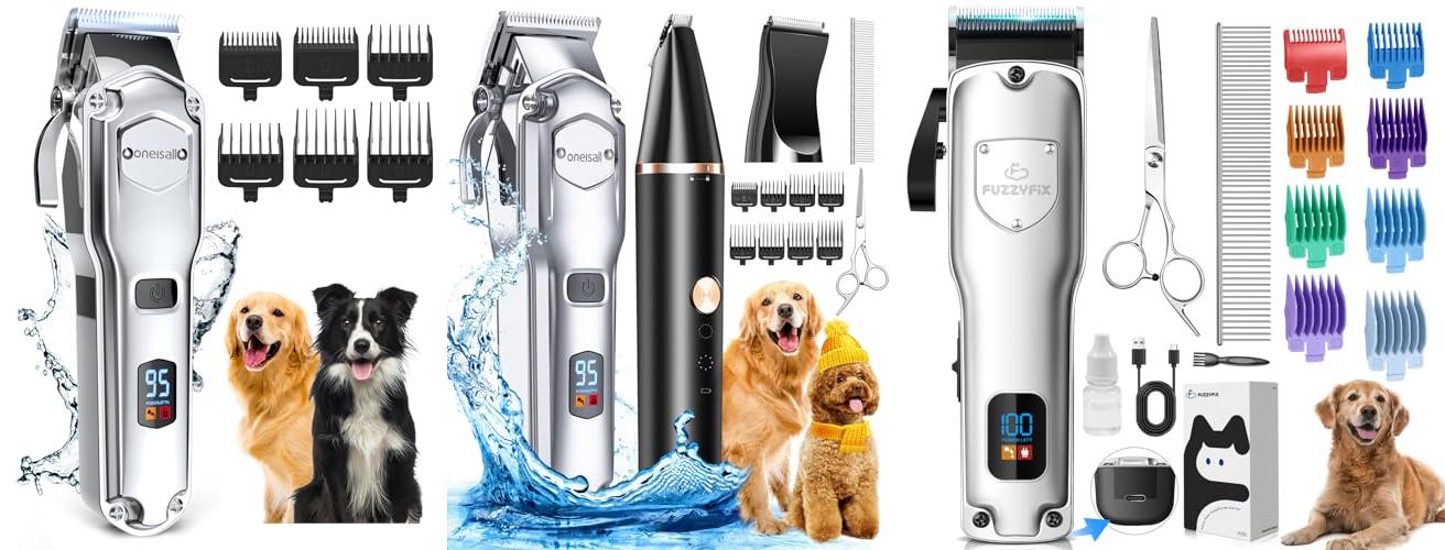 The oneisall Dog Clippers are designed for easy pet grooming. They are made for thick coats and have a stainless steel blade. These clippers are cordless, waterproof, and quiet. They also come with different sized combs for various hair lengths. You can groom your dog at home with these clippers.