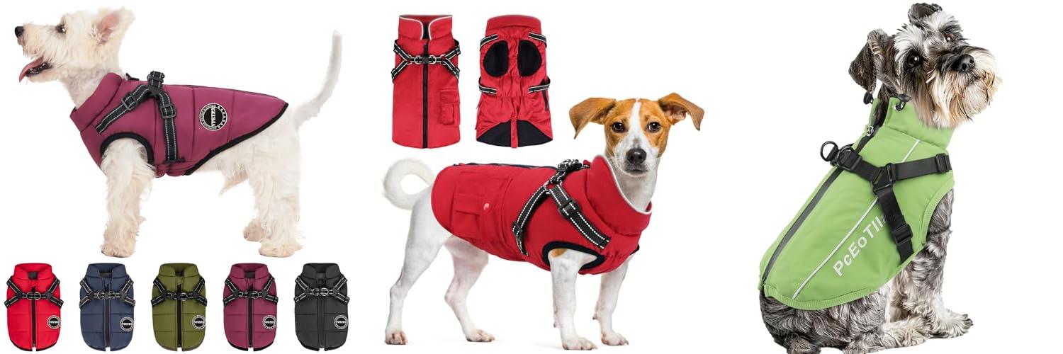 The PcEoTllar Dog Coat is a warm winter jacket for dogs. It keeps your dog warm and dry in cold weather. This coat has a built-in harness and a zipper on the back. It is waterproof, windproof, and reflective. The coat comes in green and in many sizes for small, medium, and large dogs. Your dog can wear this coat for any activity.