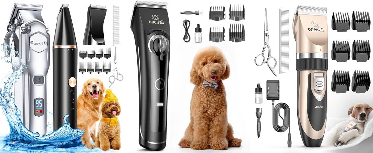 1. oneisall Dog Grooming Kit for Heavy Thick Hair&Coats/Low Noise Rechargeable Cordless Waterproof Dog Clippers for Grooming Animals&Pets/Pet Shaver with Stainless Steel Blade and Paw Trimmer