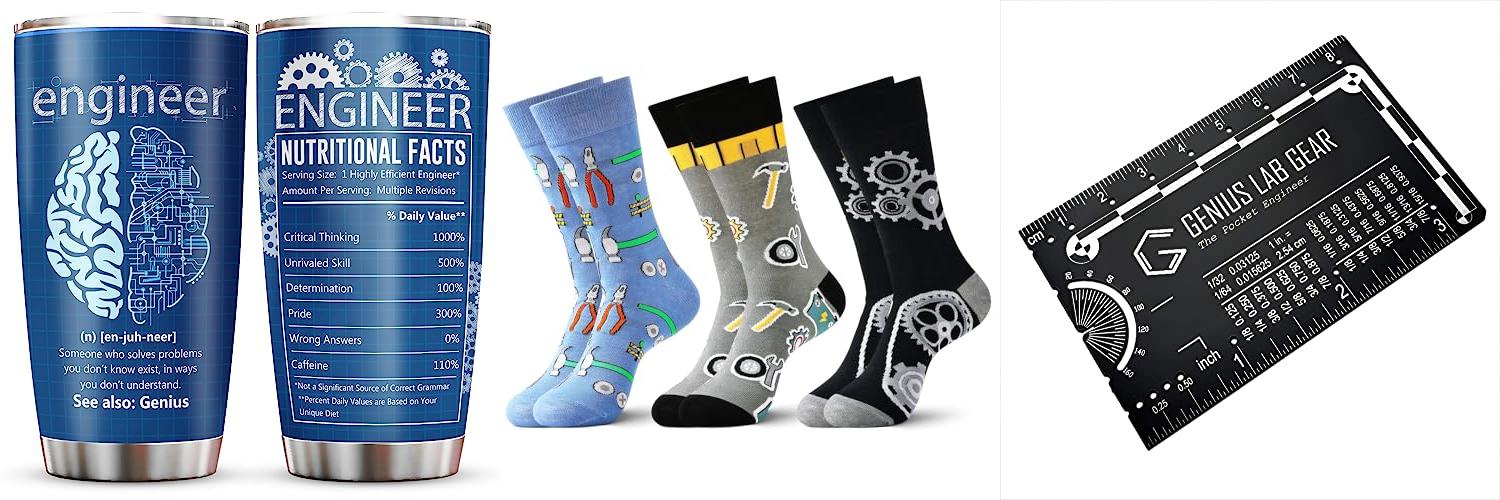 - This gift set is really comprehensive, including a coffee mug, a multi-tool pen, cool socks, and a keychain. It covers a lot of needs for an engineer.