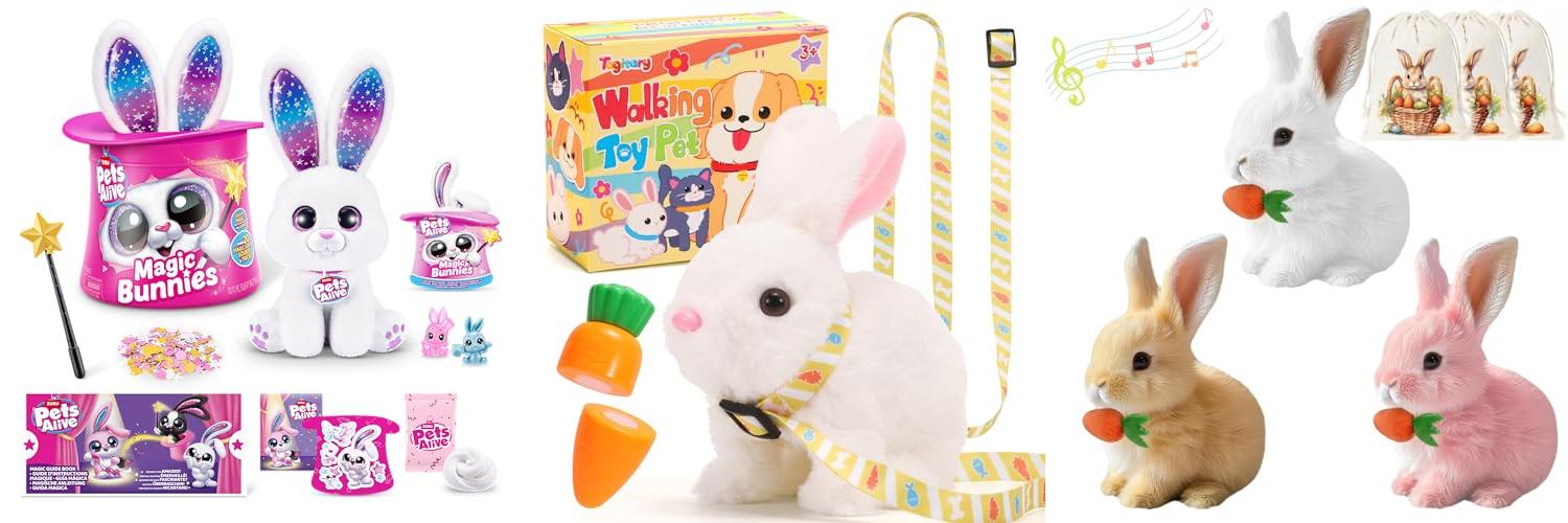 The KPPZIQ My Realistic Bunny Toy brings a lifelike rabbit experience to life! This interactive toy has soft fur and bright eyes. It can hop, twitch its nose, and wiggle its ears. This cute robot bunny is a fun gift for kids of all ages. Each package includes three bunnies ready for play. The bunnies come with scarves and a dust bag to keep them clean.