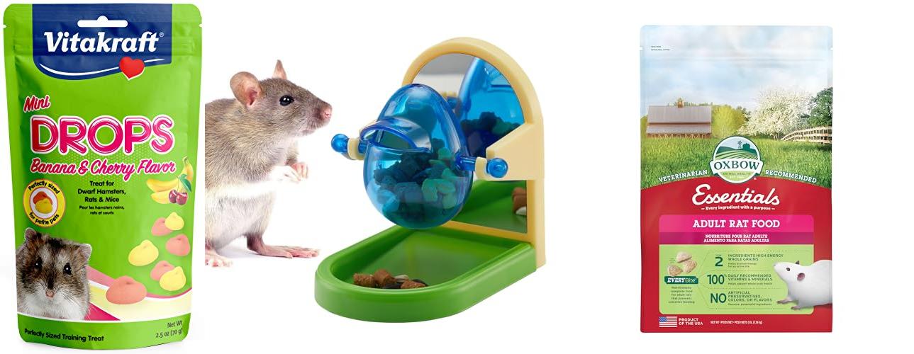 A: Rats eat rat-specific food pellets, fresh vegetables, and some fruits. Avoid giving them too many treats.