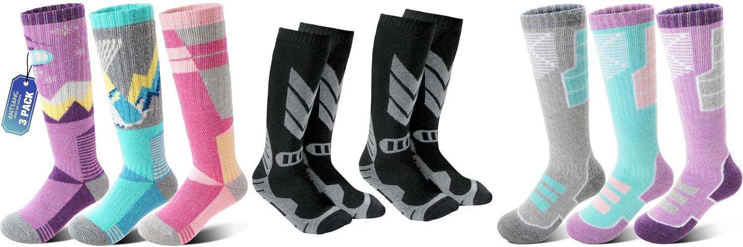 3. Anlisim Kids Merino Wool Ski Socks 3 Pairs Girls Boys Thermal Winter Warm Thick Breathable Socks for Skiing Snowboarding (Mixed