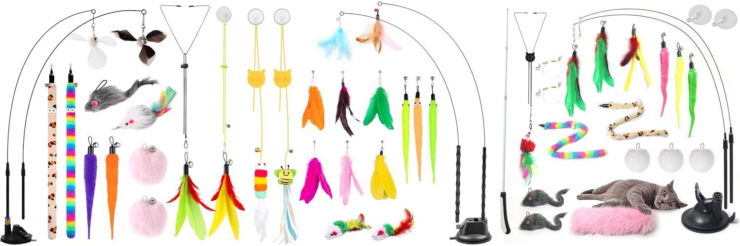 • Variety of Play: This set includes two suction cup bases, two wands, and a generous assortment of 10 interchangeable toys like feathers, balls, and mice. Your cat will never get bored!