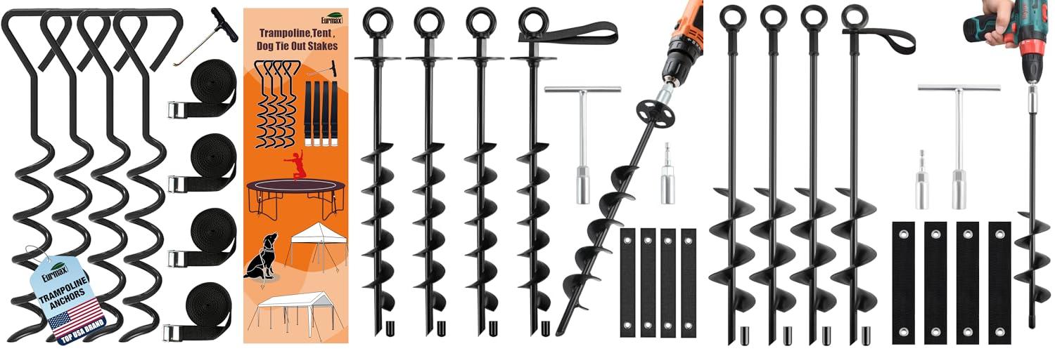 1. Eurmax USA Trampoline Stakes Heavy Duty Trampoline Parts Corkscrew Shape Steel Stakes Anchor Kit with T Hook for Trampolines -Set of 4 Bonus 4 Strong Belt