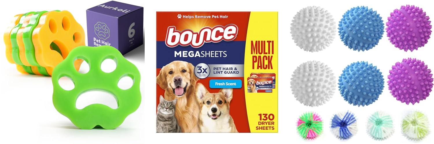 - The set includes both dryer balls and pet hair removers.