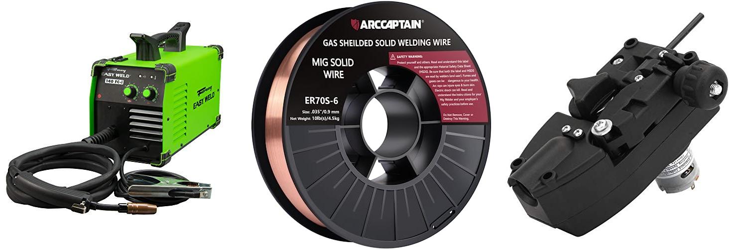 - The package includes everything you need to get started: the welder, a MIG torch, ground clamp, brush/hammer, a spool of wire, and extra contact tips.